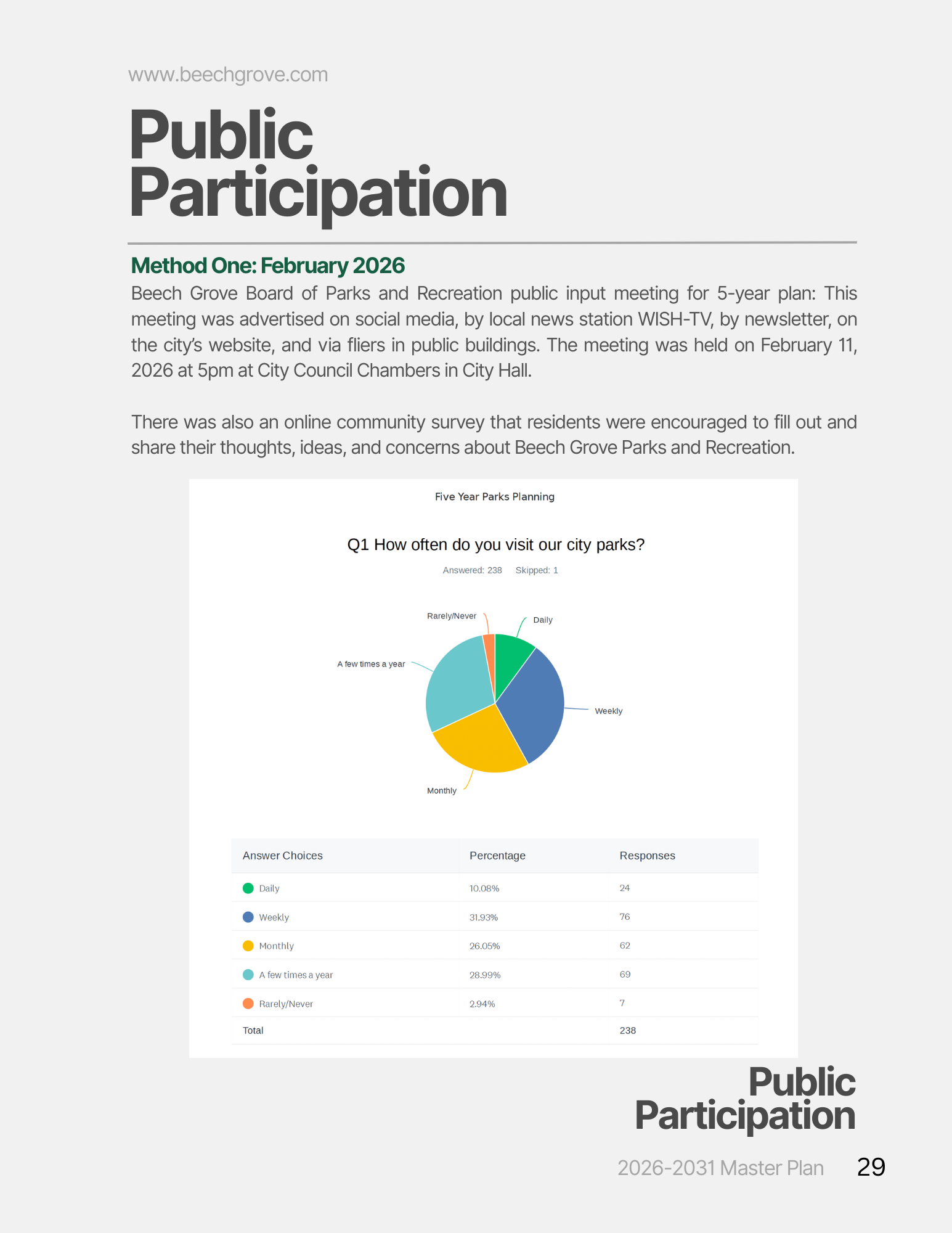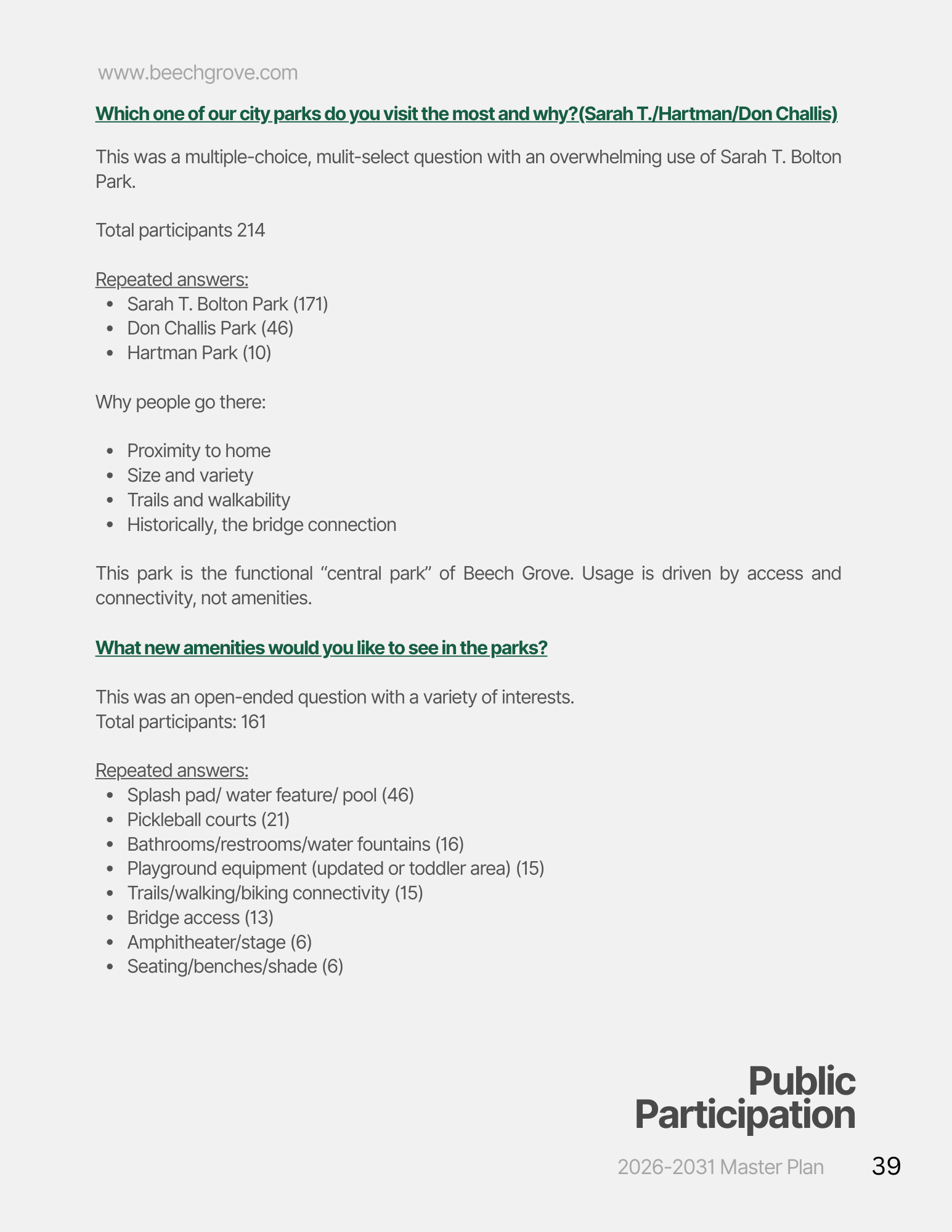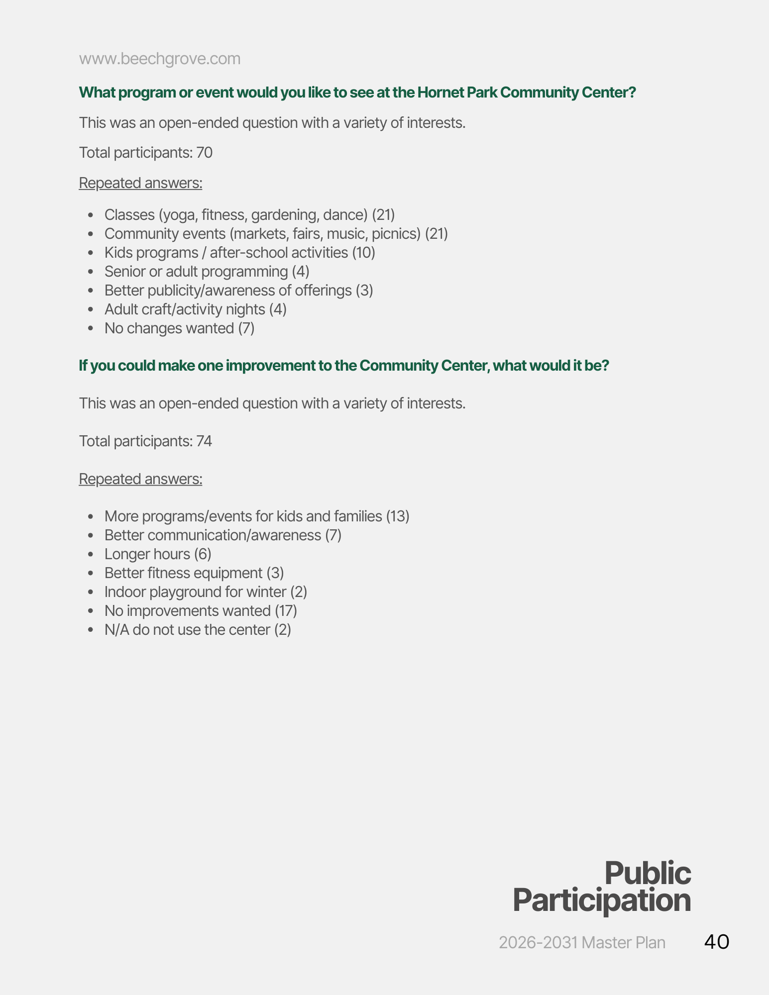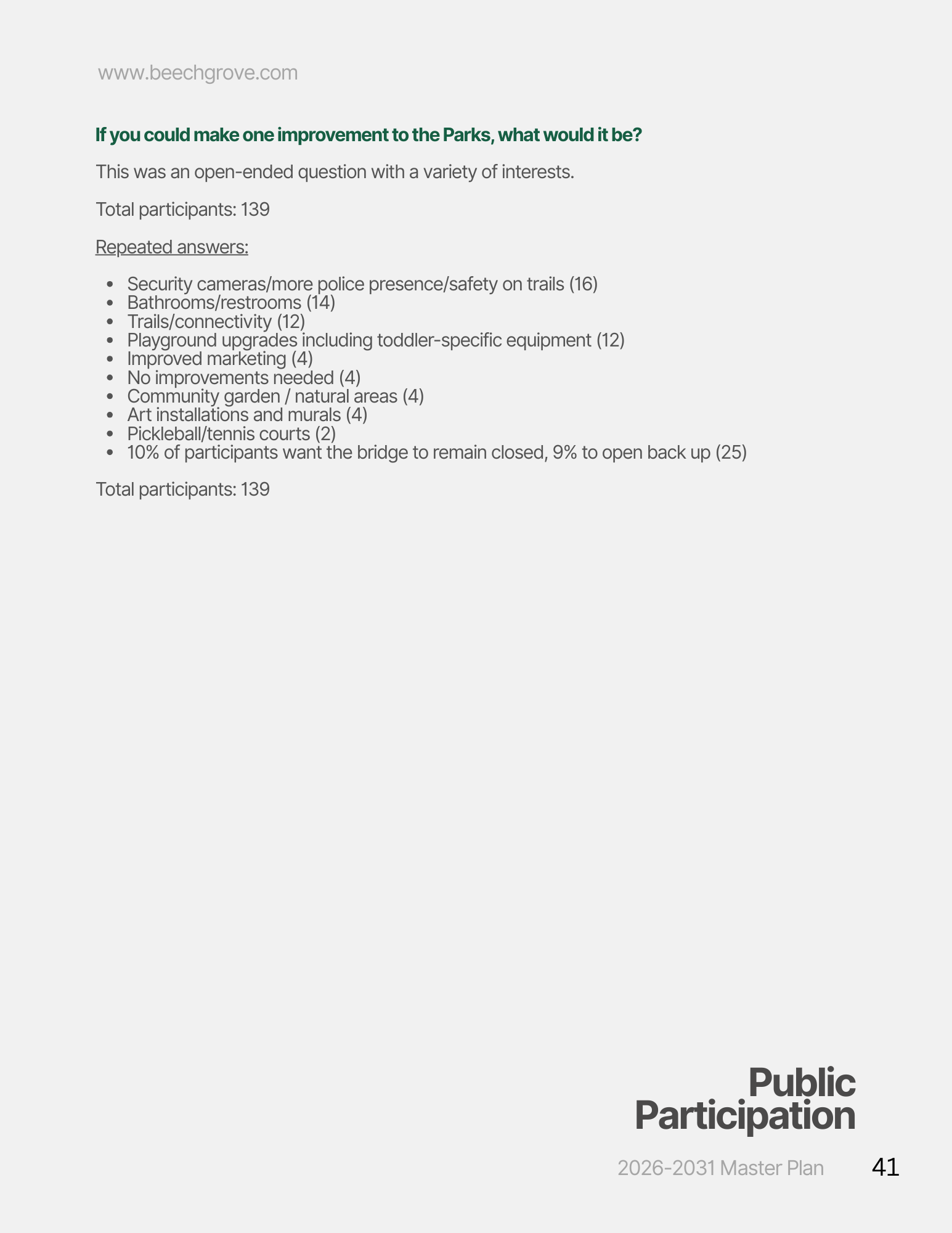 On February 11, 2026, the Parks Board and Parks Department hosted an open house to gather community feedback on the proposed park plans for the upcoming five years. An online survey was made available from January 4 to February 5, allowing residents to share their thoughts, and the results were presented during the open house. The current stage involves reviewing the feedback received and finalizing the plan ahead of the April 15 deadline set by the State.