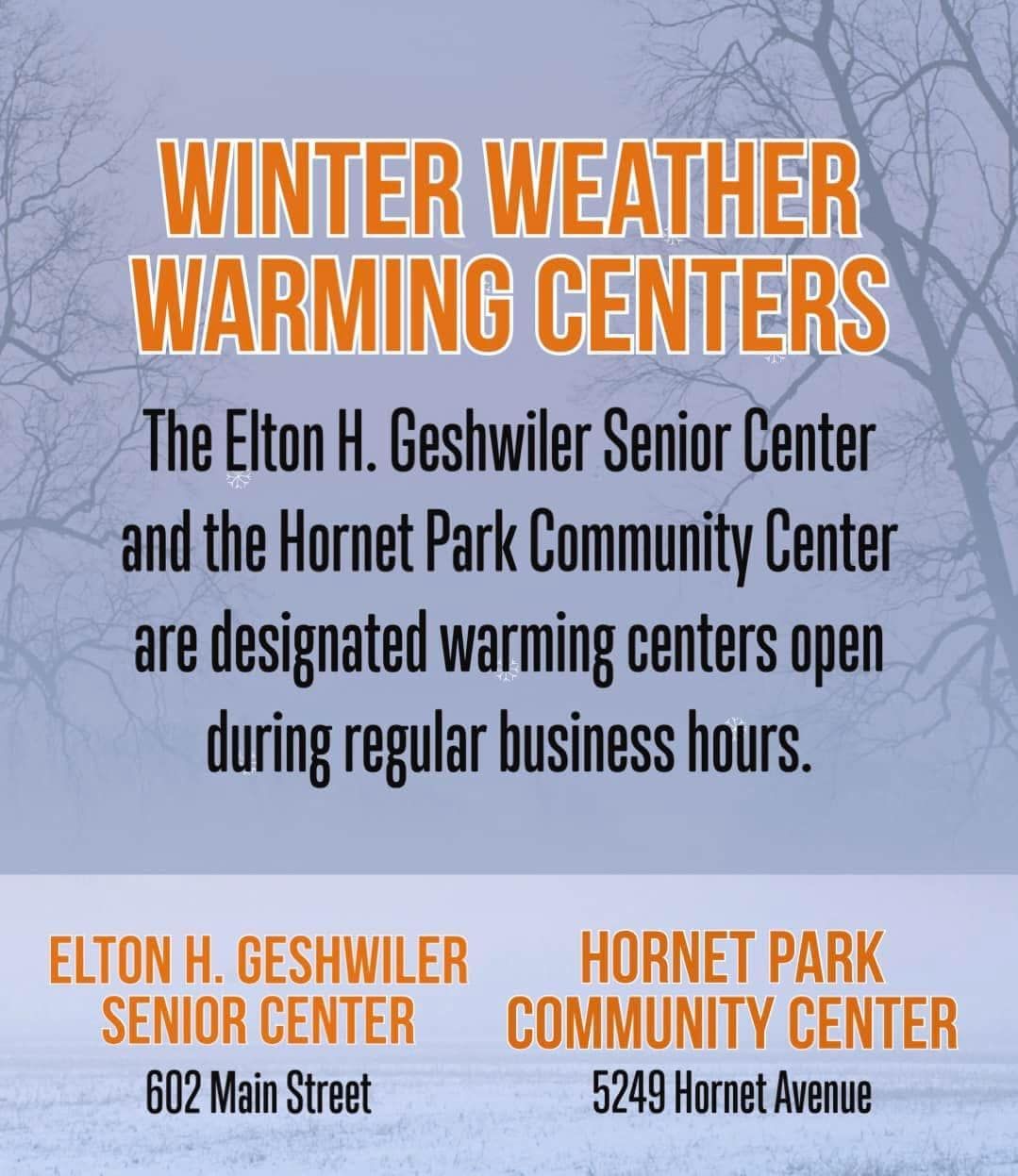 Hornet Park Community Center and the Elton H. Geshwiler Senior Center serve as designated warming centers throughout the winter during regular business hours. Should snow accumulation trigger a Level 3 travel advisory, this may change, as only emergency vehicles will be permitted on the roads.